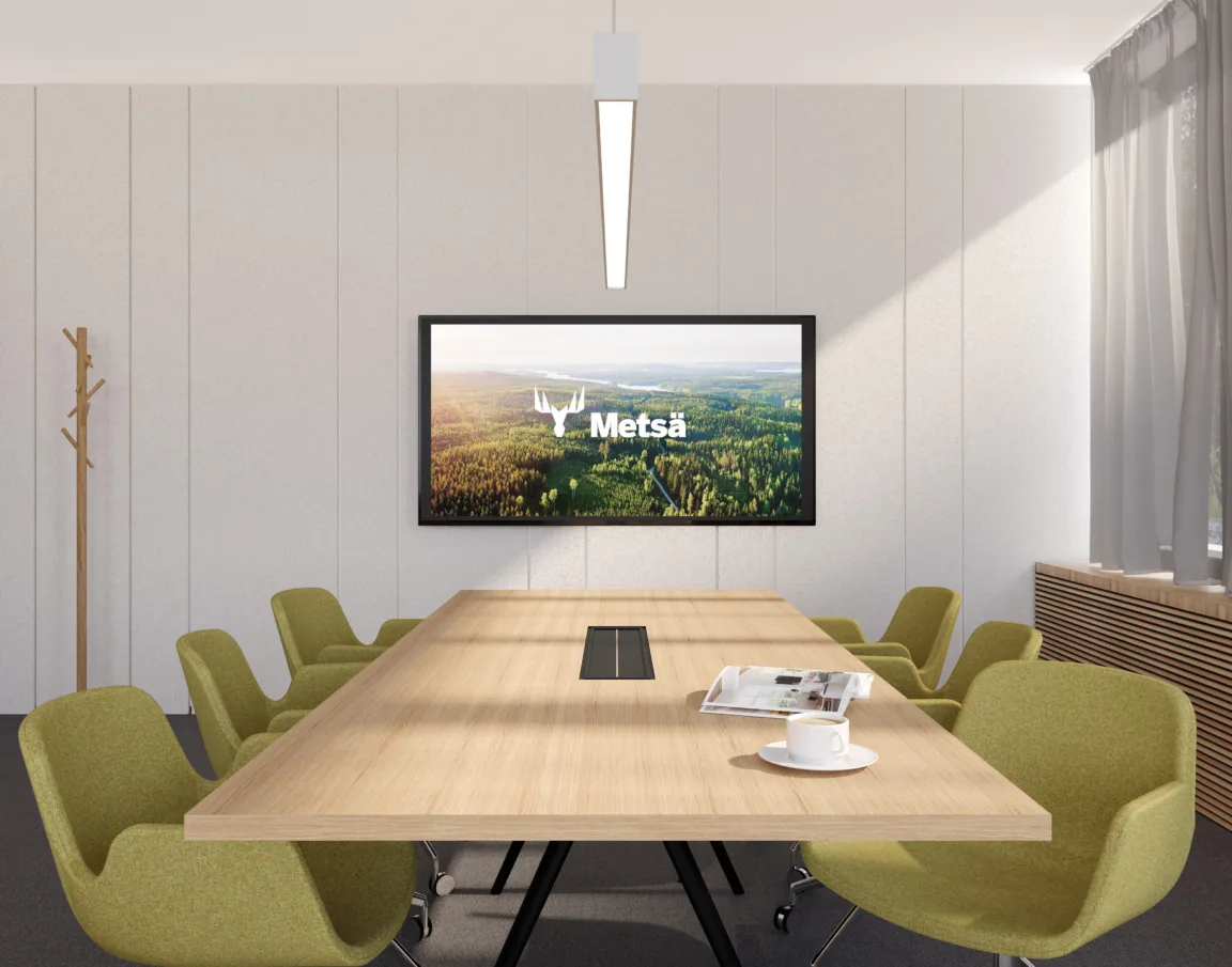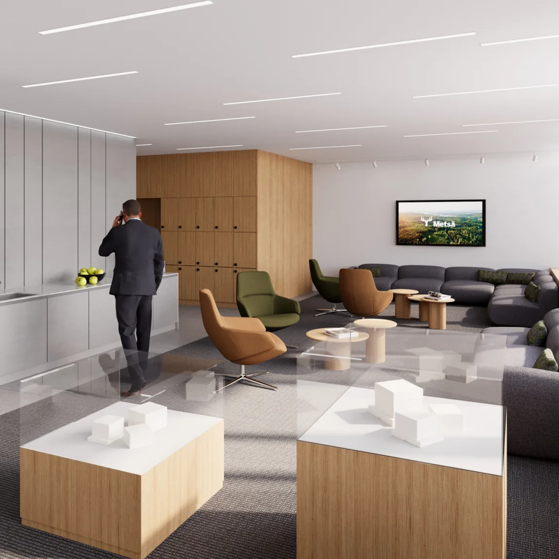 Meeting rooms combine integrated technology, flexible furnishings, textile-tile or linoleum flooring and light wave curtains to suit varied uses. Understory-inspired planting adds sensory richness. The concept scales from light updates to comprehensive renewals, ensures consistent quality across sites, and supports Metsä’s sustainability goals and lifecycle thinking.