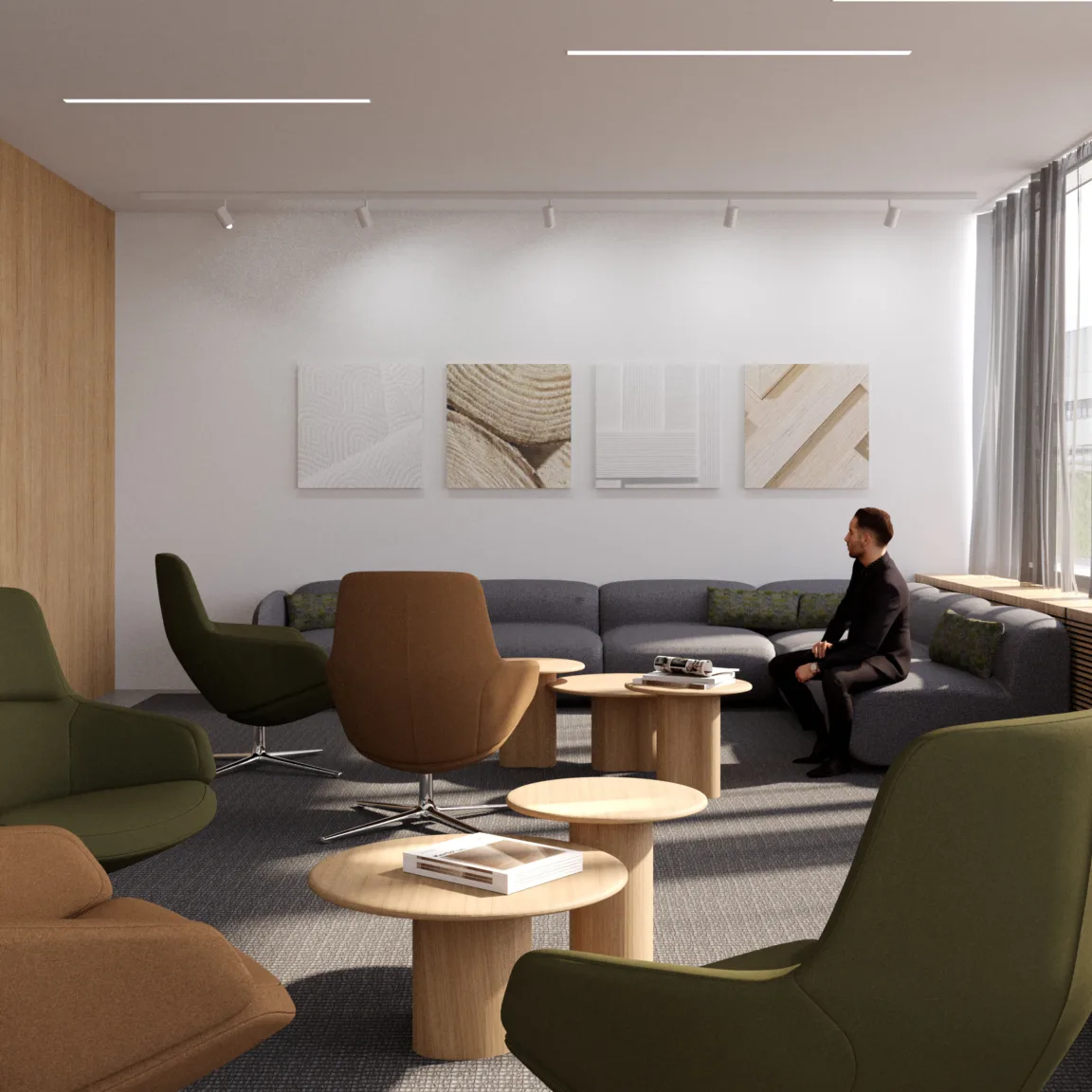 Vertical “Forest Rhythm” wall panels allude to tree trunks and draw the eye upward. Authentic materials—oak or birch veneer and grey Valchromat—and durable, easy-to-maintain surfaces meeting public-space requirements create a timeless, long-lasting expression. Lighting and acoustics ensure comfort for both work and encounters.