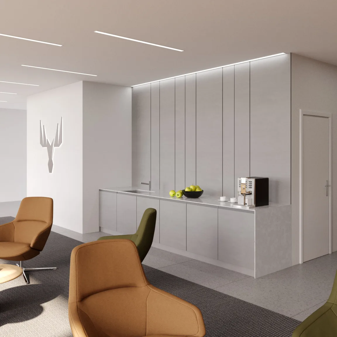 In lobbies, a minimalist coffee point is integrated into the panelled wall, clear cloak storage serves guests, and a modular lounge set on a large area rug invites people to linger. Showroom vitrines present Metsä’s expertise, while restrained graphics and wayfinding strengthen the brand; the Hirvenpää logo is positioned as a subtly lit focal point.