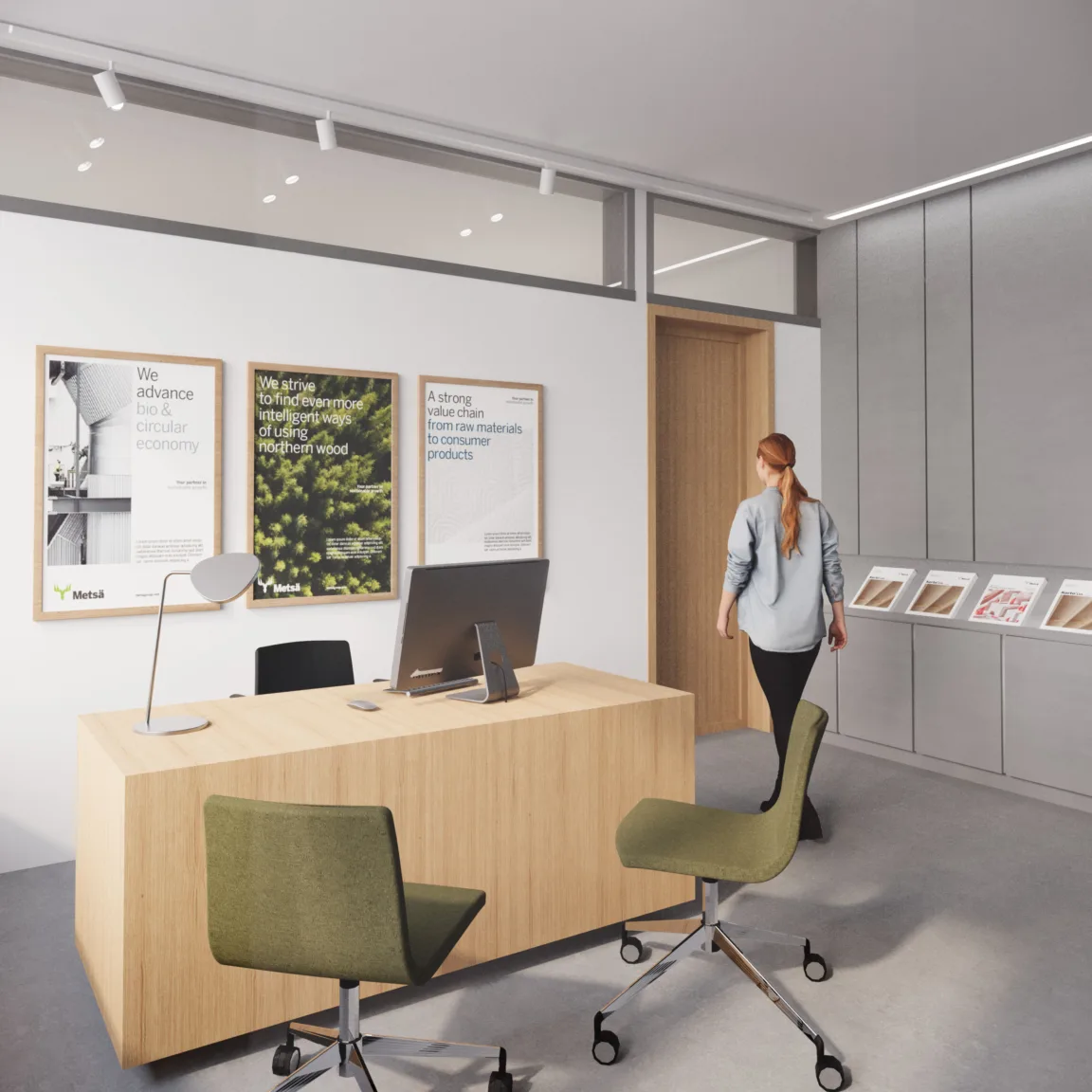 Metsä Group’s new workplace concept unifies visitor and client areas, conveying the character of the northern forest through architecture and interiors.