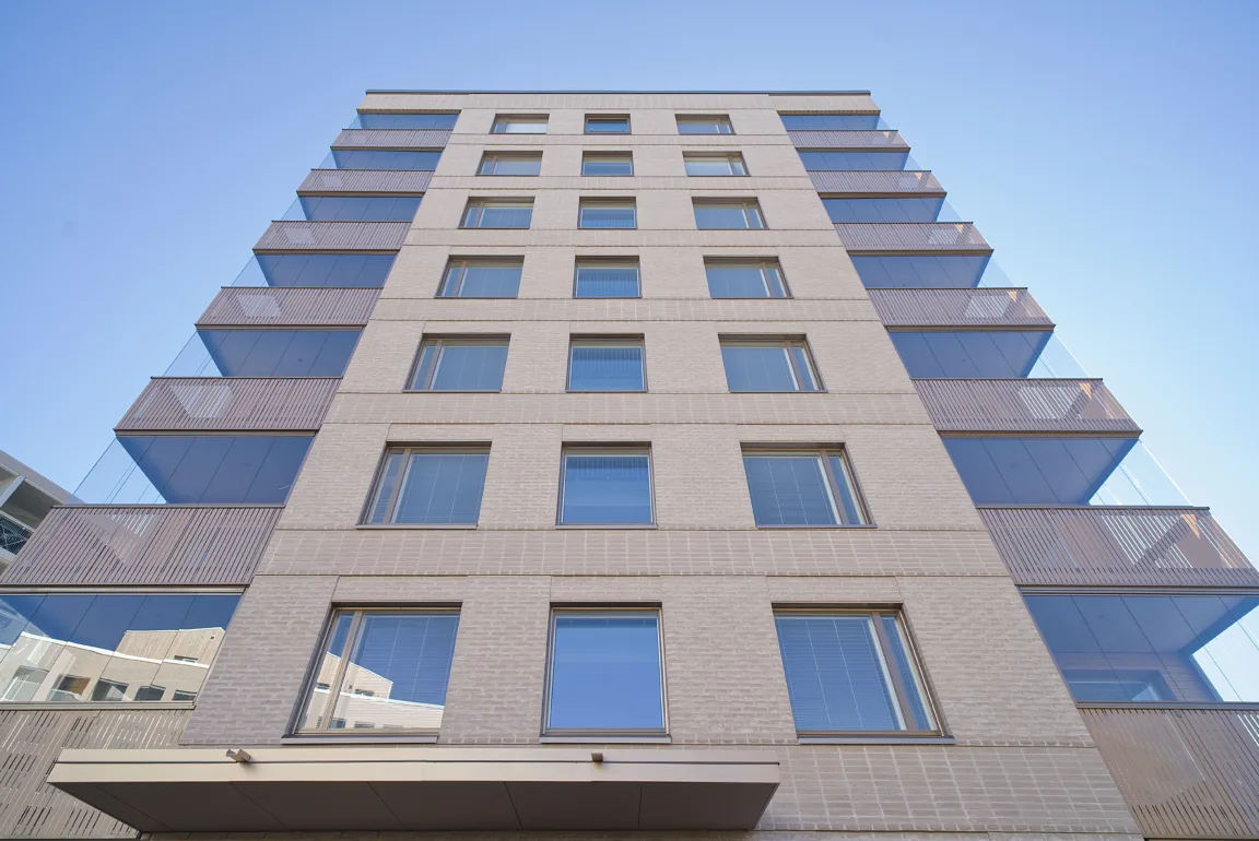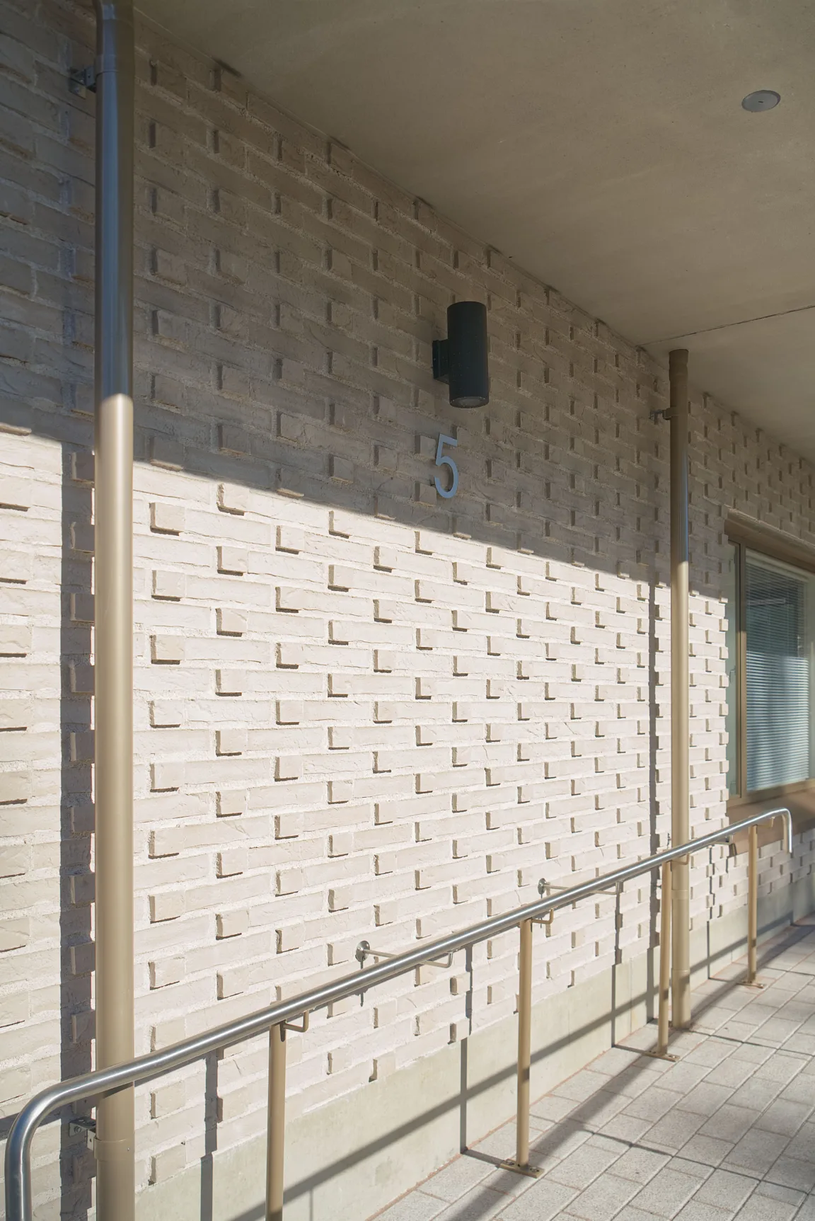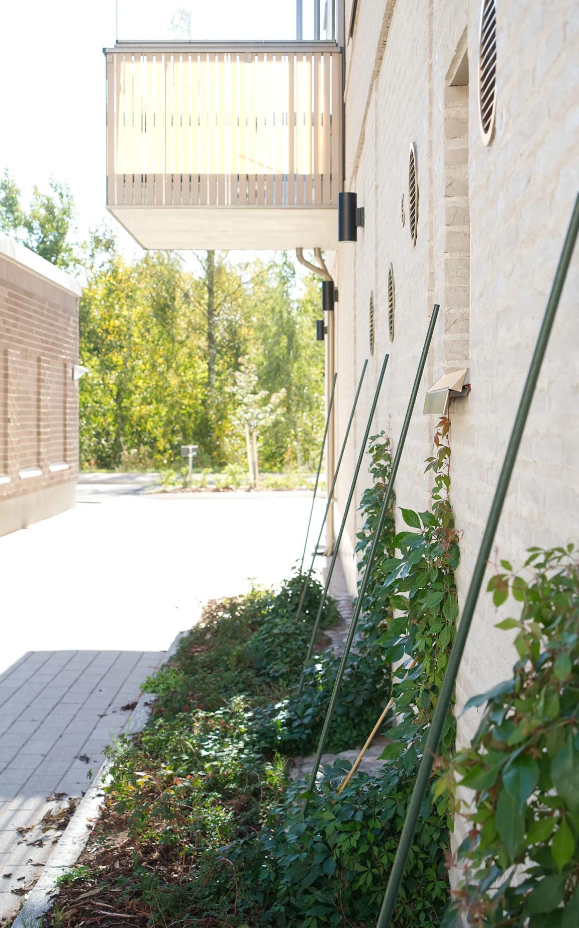 Rakennuksen arkkitehtuuria määrittävät huolella valitut materiaalit ja yksityiskohdat. Pistetalo ja siihen katoksella liittyvä talousrakennus on muurattu paikalla vaaleasta pellavan värisestä biopoltetusta tiilestä. Julkisivujen aukotus on rauhallinen, ja ikkunat ovat pääosin samankokoisia ja linjassa keskenään. Pistetaloa kiertää välipohjien kohdalla ladonnaltaan poikkeava vaaka-aihe, joka luo hienovaraista vaihtelua muuraukseen. Parvekkeet ovat lyhyillä sivuilla sisäänvedettyjä ja pitkillä sivuilla ulokkeena; niiden taustaseinät on paneloitu puulla ja kaiteissa on tiilen sävyinen pystyaiheinen silkkipainokuvio, joka lisää asukkaiden yksityisyyttä ja antaa rakennukselle erottuvan luonteen. Sisäänkäyntejä korostetaan koristemuuratuilla seinäosuuksilla. Metalliosien, kuten ikkunankarmien, sävyt on sovitettu harmonisesti tiilipintaan, mikä luo tasapainoisen ja viimeistellyn yleisilmeen. Rakennuksen katolla sijaitsee aurinkovoimala, ja yhteistilojen seinä- ja lattialaatat on toteutettu kierrätyslaatoista.