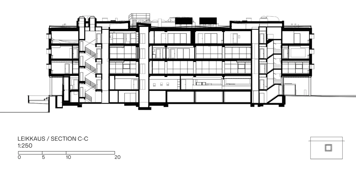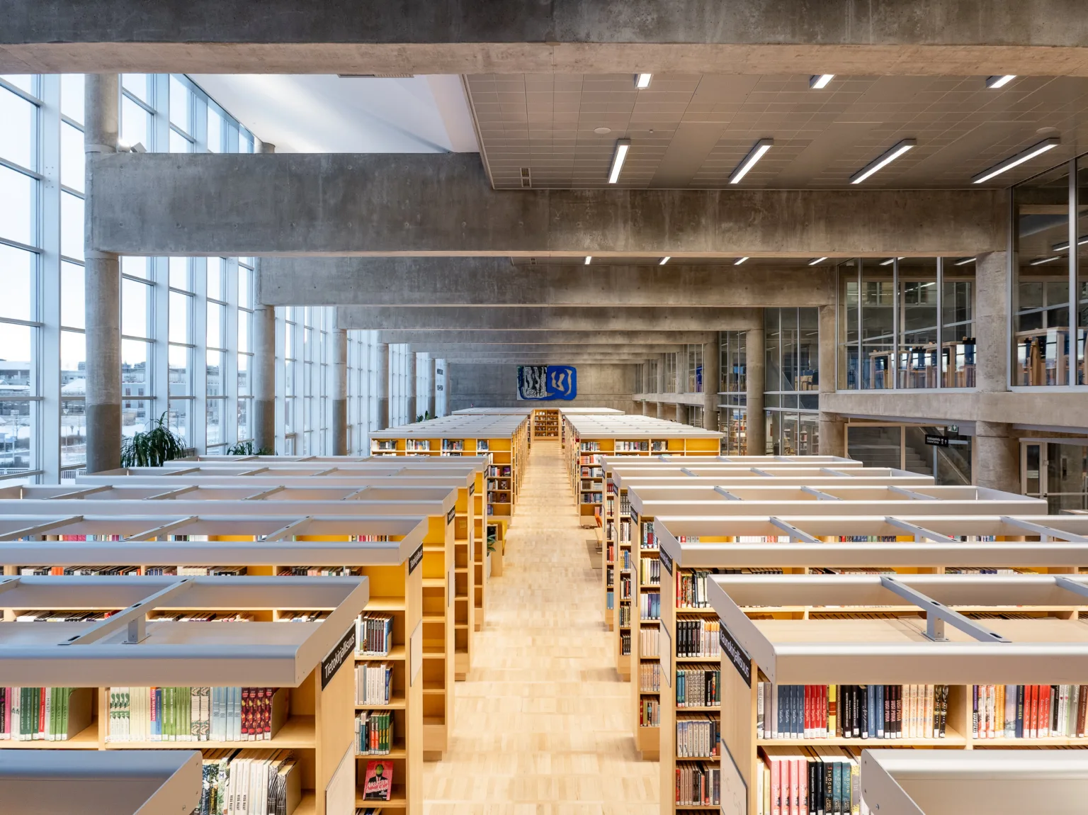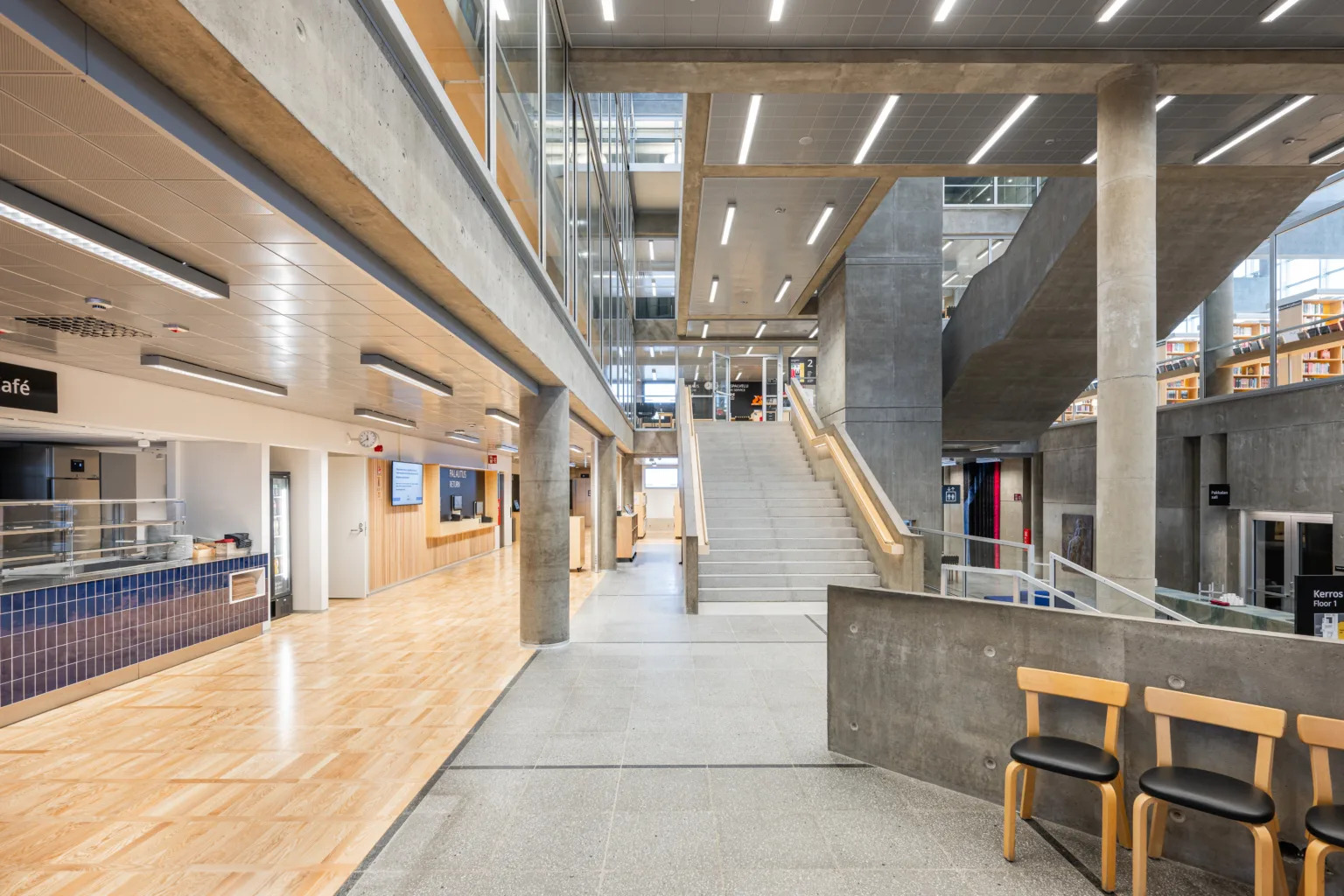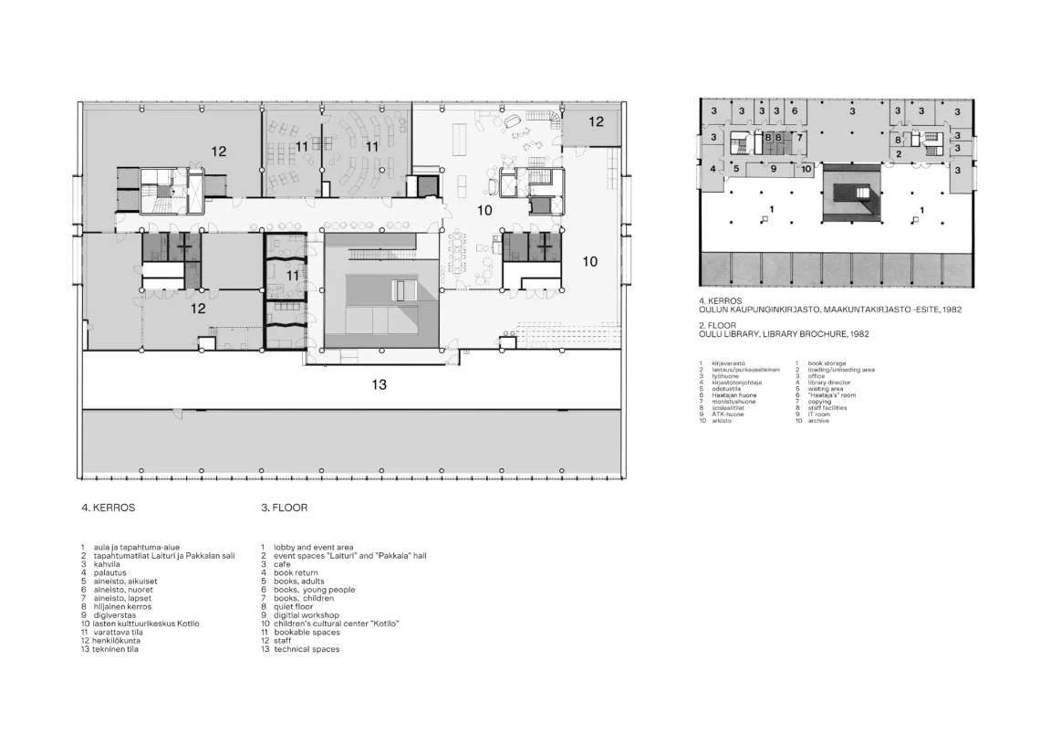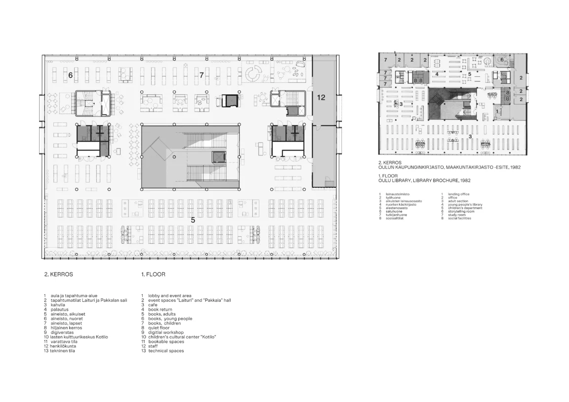 Kirjaston uudistettu katutaso toimii tapahtumien ja kohtaamisten kerroksena, jossa sijaitsevat kahvila sekä toisiinsa avautuvat tapahtumatilat Pakkalan sali ja Laituri. Toinen kerros on kirjaston sydän: avoin ja valossa kylpevä kirjastosali, jossa on runsaasti aineistoa eri-ikäisille asiakkaille. Kolmas kerros tarjoaa tiloja rauhallisempaan työskentelyyn, kuten ryhmätyötiloja, lukusaleja ja digiverstaan. Neljäs kerros, joka on nyt ensimmäistä kertaa avattu yleisölle, kokoaa lastenkulttuurikeskus Kotilon, varattavia kokoustiloja, pieniä äänieristettyjä studioita sekä henkilöstön työtilat.