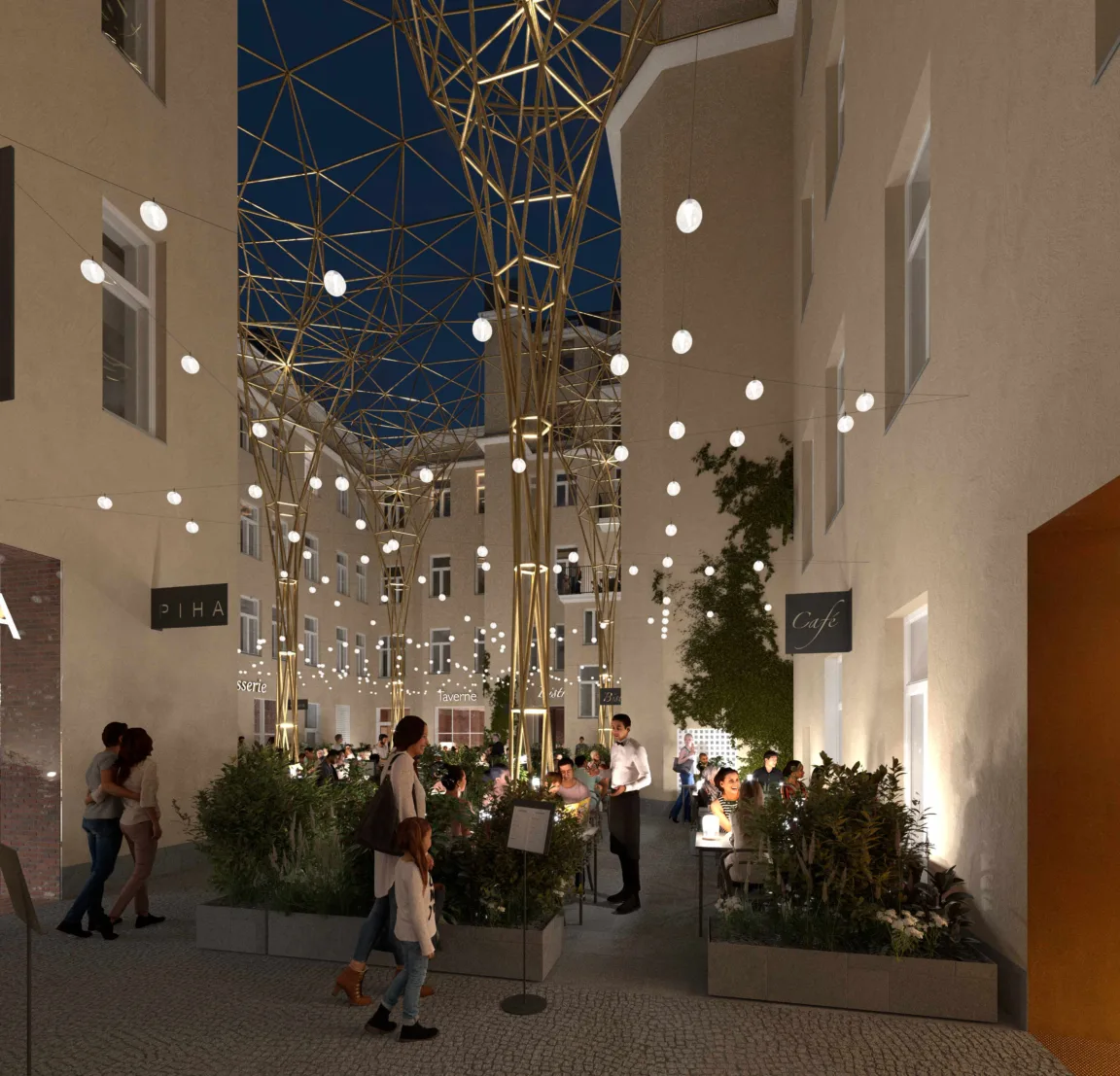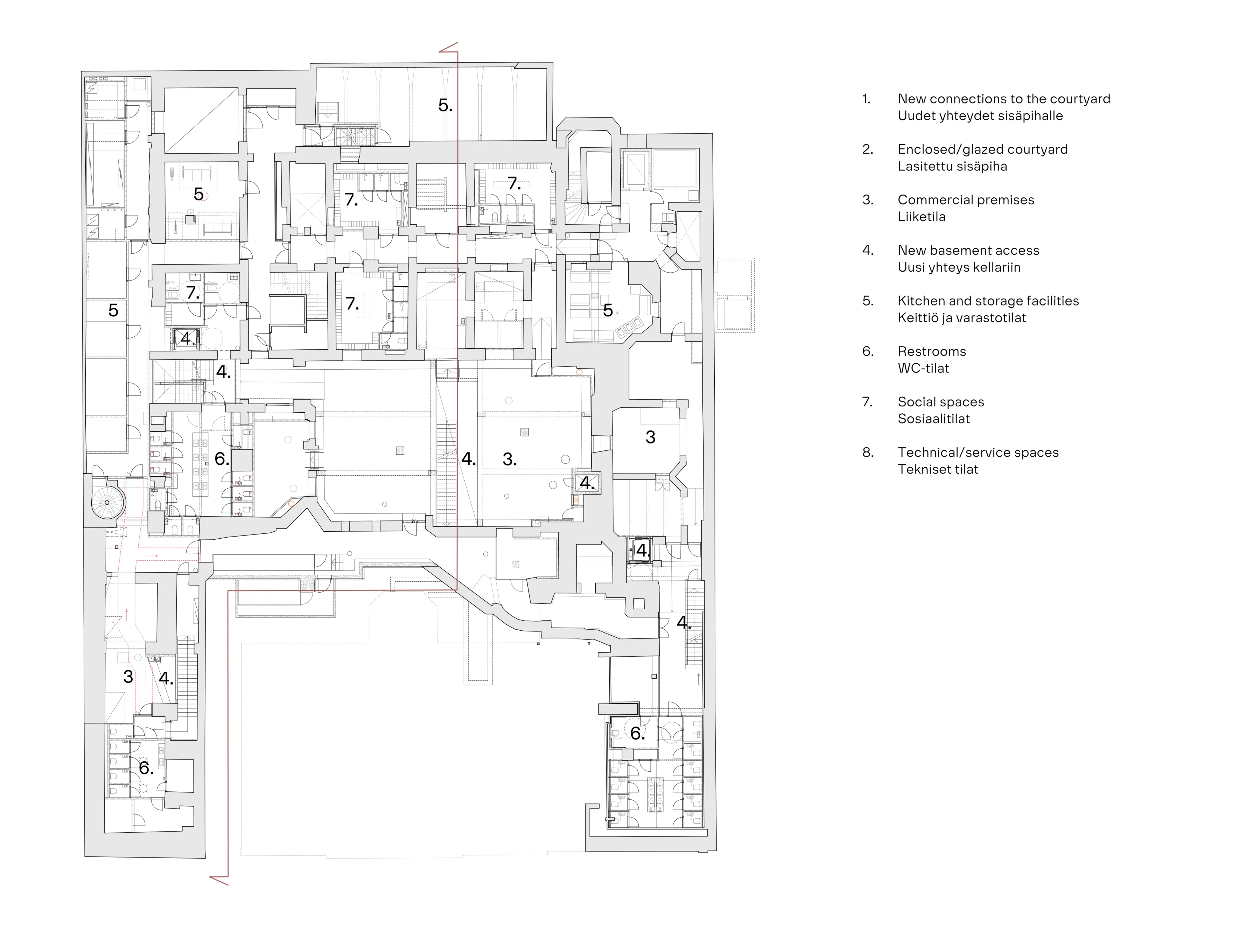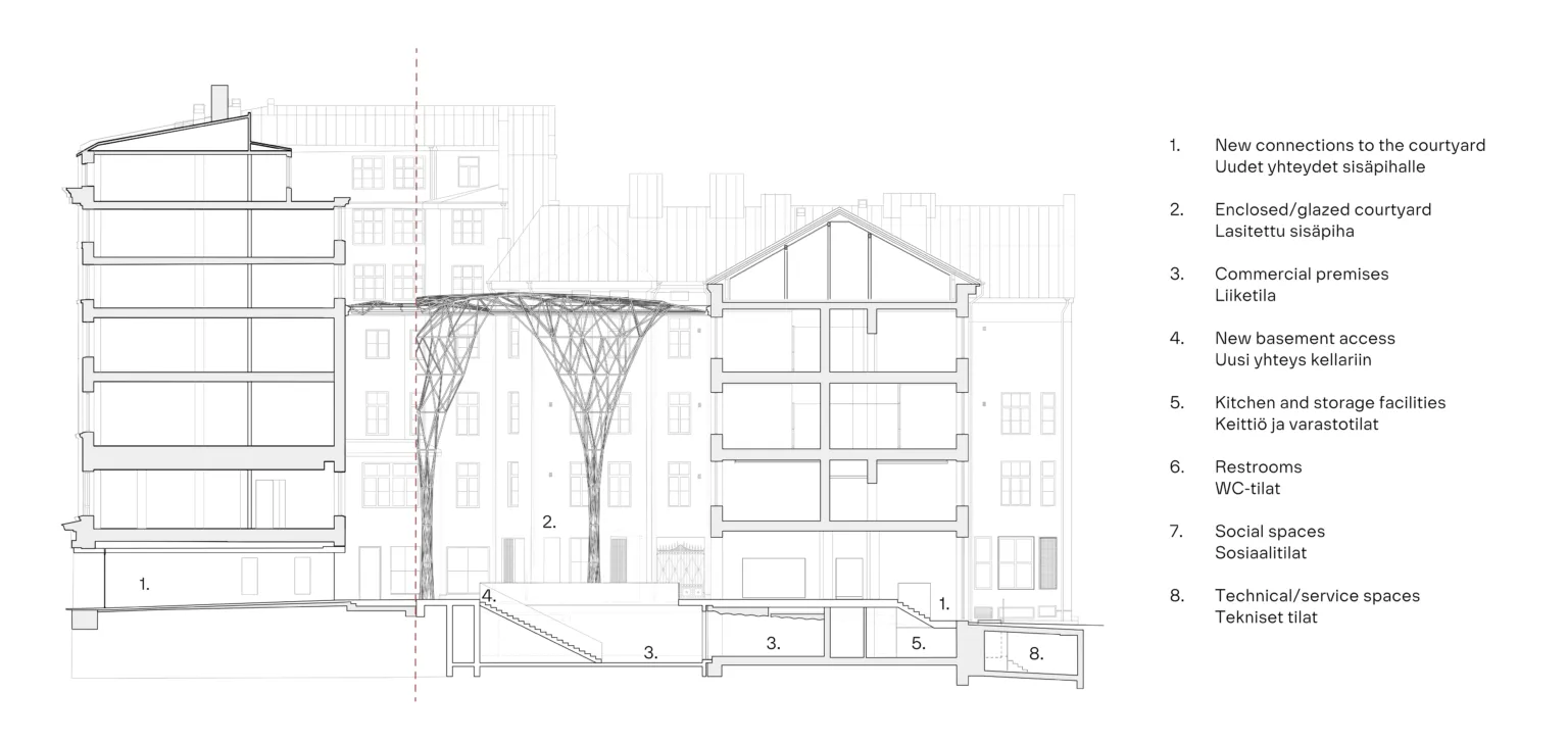 Katutason lisäksi myös kellarikerrokseen sijoitetaan uutta liike- ja ravintolatilaa. Kellariin avautuu uusi kulkureitti sisäpihan keskeltä, ja siellä rouheat vanhat tiiliseinät ja holvit luovat ainutlaatuisen tunnelman. Katetulle sisäpihalle johtavat porttikäytävät muuntuvat osaksi uutta lämmintä sisätilaa. Messinkiverhoiltu käytävä Esplanadilta kutsuu ohikulkijoita astumaan sisään kaupunkitilaan, joka sykkii elämää aamusta iltaan kaikkina vuodenaikoina.