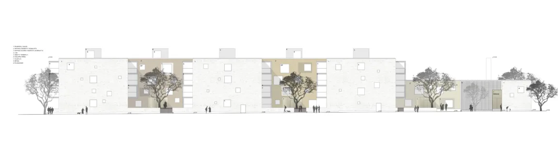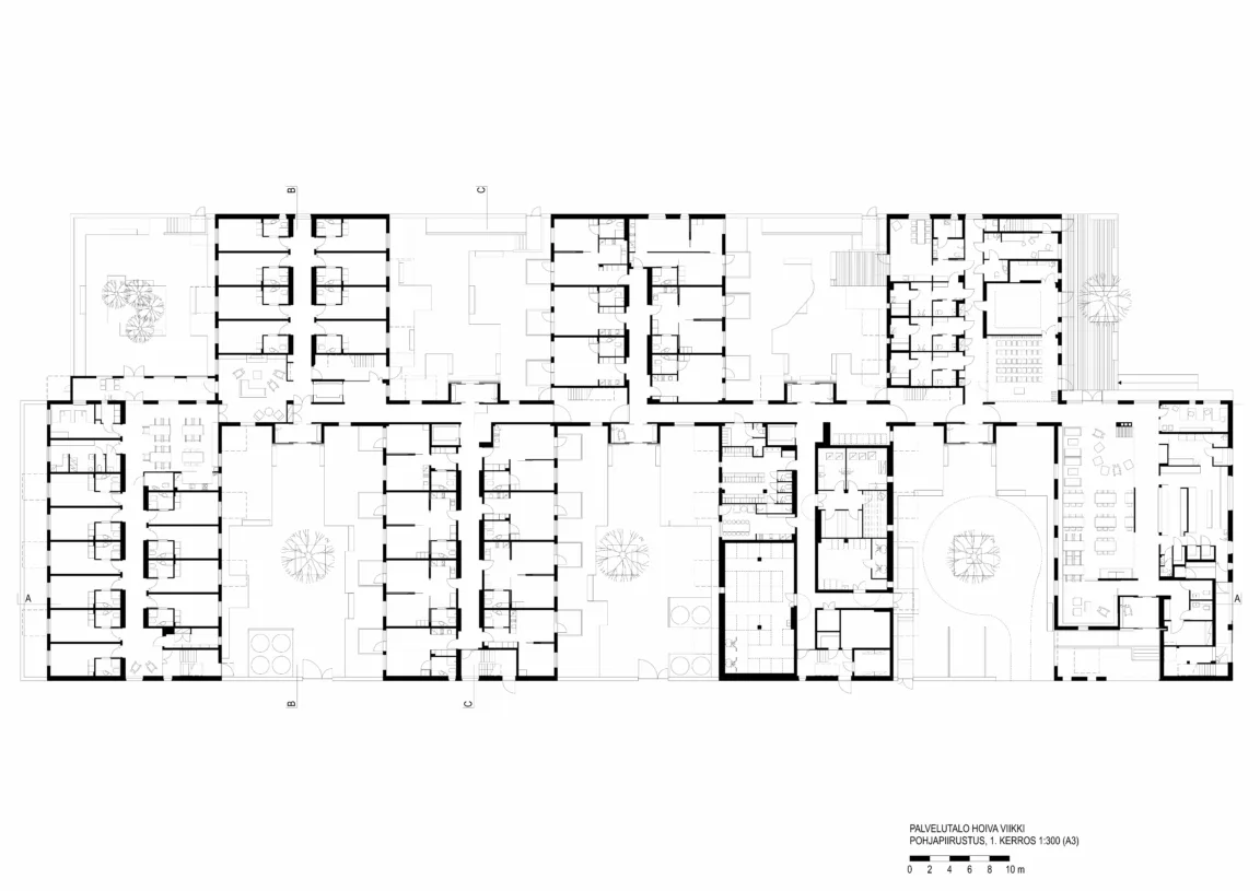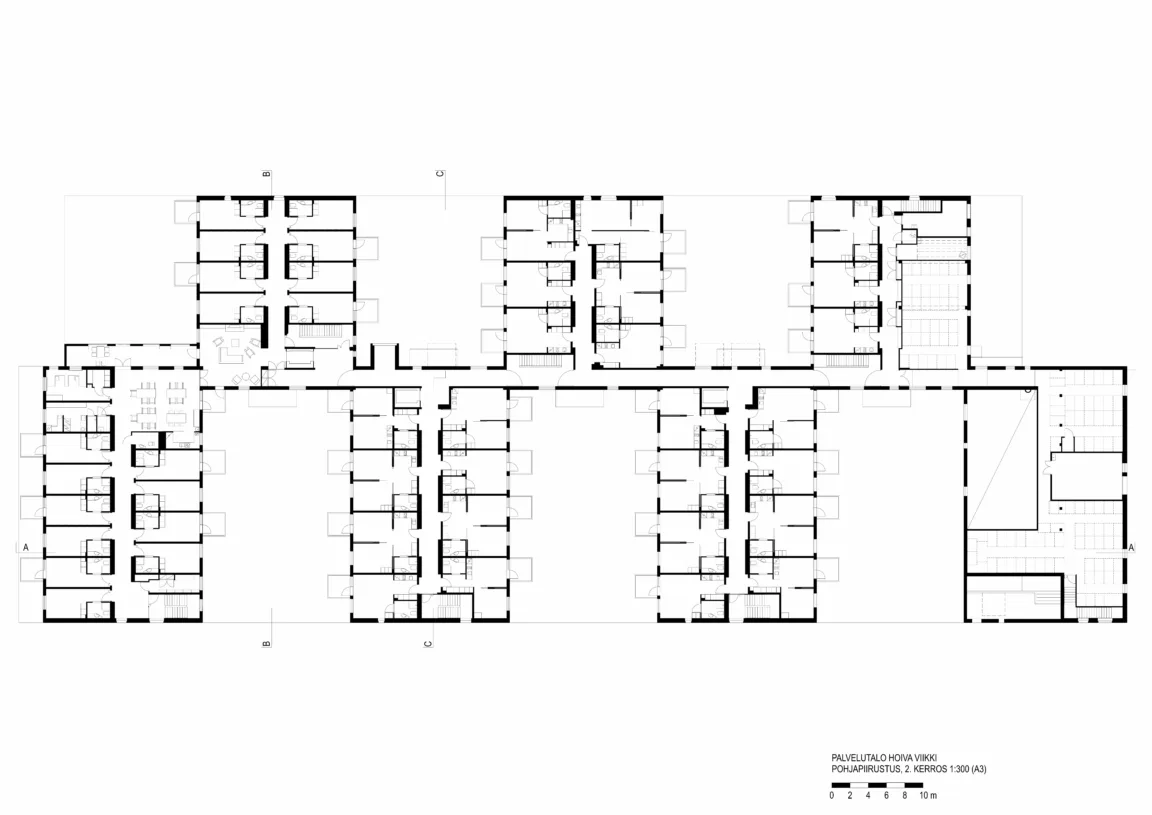 Hankkeen tilaohjelma tarkentui vuosien aikana, ja lopullinen kokonaisuus sisältää 109 palveluasuntoa sekä kaksi ryhmäkotia. Rakennus koostuu viidestä asuntomassasta ja kahdesta matalammasta palvelu- ja yhteistilojen osasta, jotka on yhdistetty sisäisillä käytävillä. Ratkaisu selkeyttää orientaatiota ja tehostaa palveluiden liikkumista.