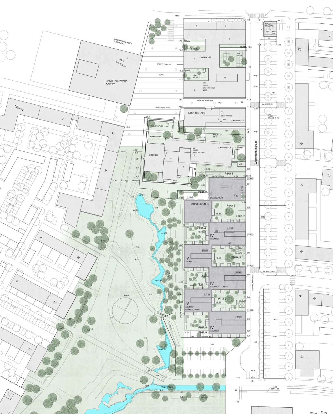 Viikin palvelutalokokonaisuus perustuu Helsingin kaupungin ja seurakuntayhtymän vuonna 2000 järjestämään kutsukilpailuun. Voittanut ehdotus muodosti palvelutalosta, kirkosta ja nuorisotalosta yhtenäisen, muurimaisen kokonaisuuden. Toteutunut rakennus jatkaa tätä kaupunkikuvallista ideaa: kaksi–neljäkerroksiset massat sijoittuvat vaaleiden tiilimuurien väliin ja avautuvat puiston suuntaan suojaisien sisäpihojen kautta.