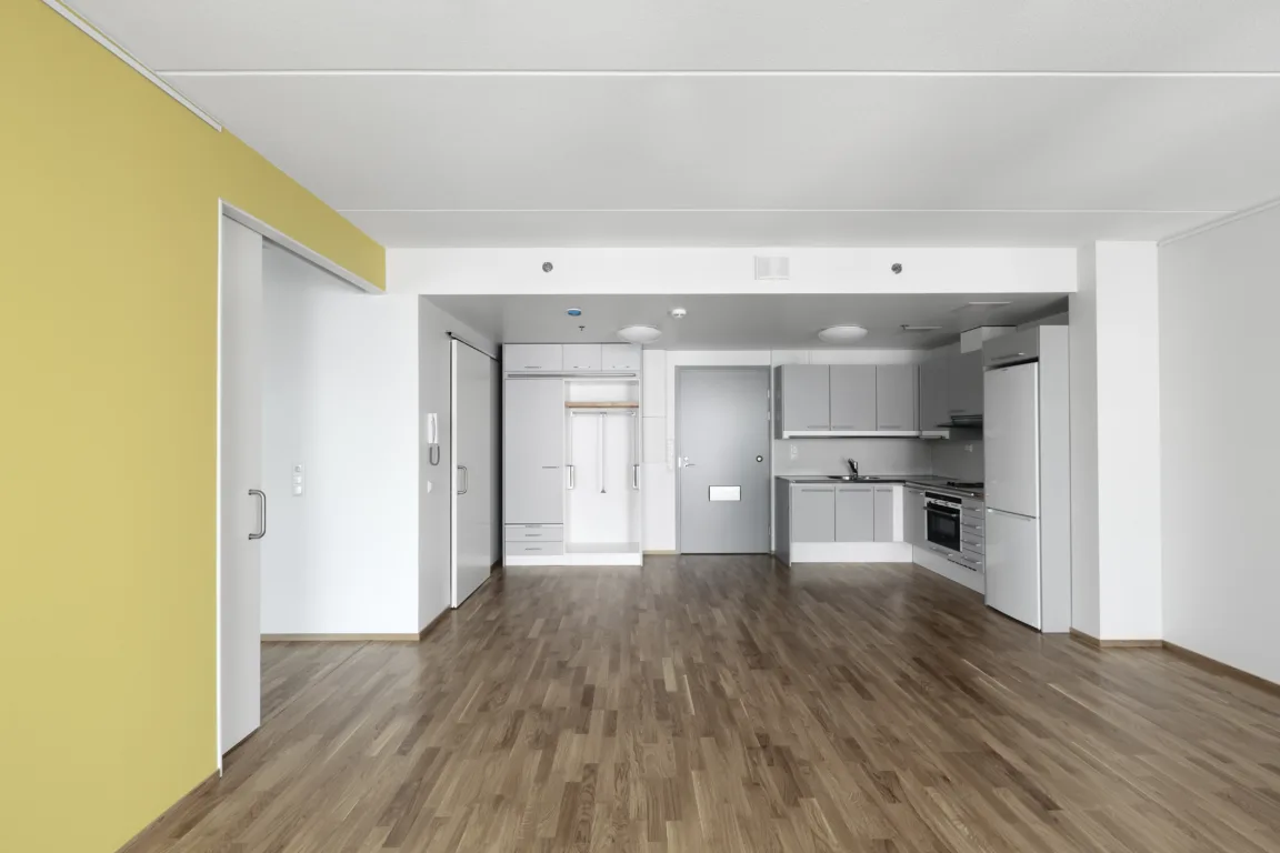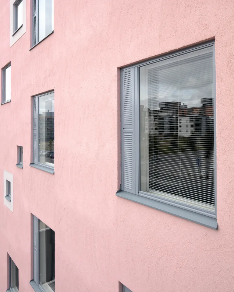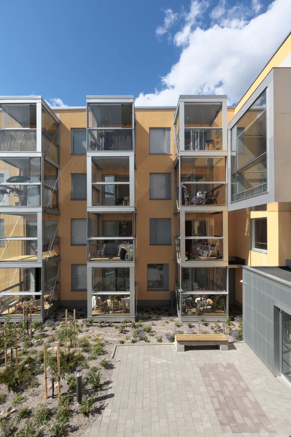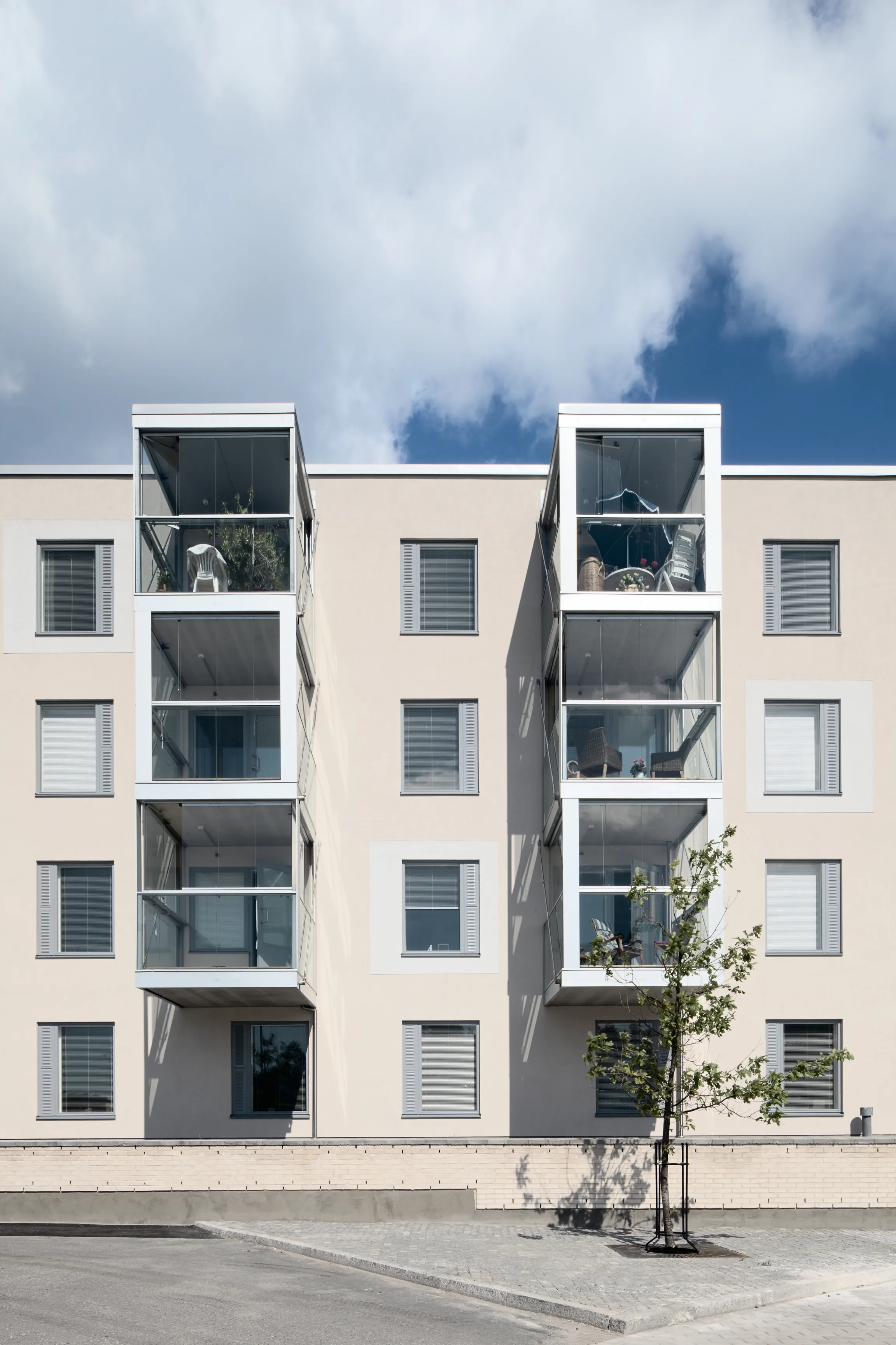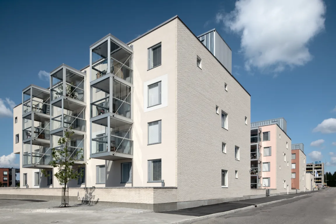 Materiaalivalinnat tukevat kokonaisuuden identiteettiä. Vaalea tiilijulkisivu on ajaton, kestävä ja vaatii vähän huoltoa. Sisäpihoissa käytetyt erisävyiset rappaukset tuovat lämpöä, erottavat pihat toisistaan ja auttavat orientoitumisessa. Kevyet lasitetut parvekkeet pehmentävät selkeää massoittelua ja säilyttävät näkymät maisemaan. Sisätilojen hallitut väriakentät vahvistavat tilojen identiteettiä ja helpottavat arjen suunnistamista.